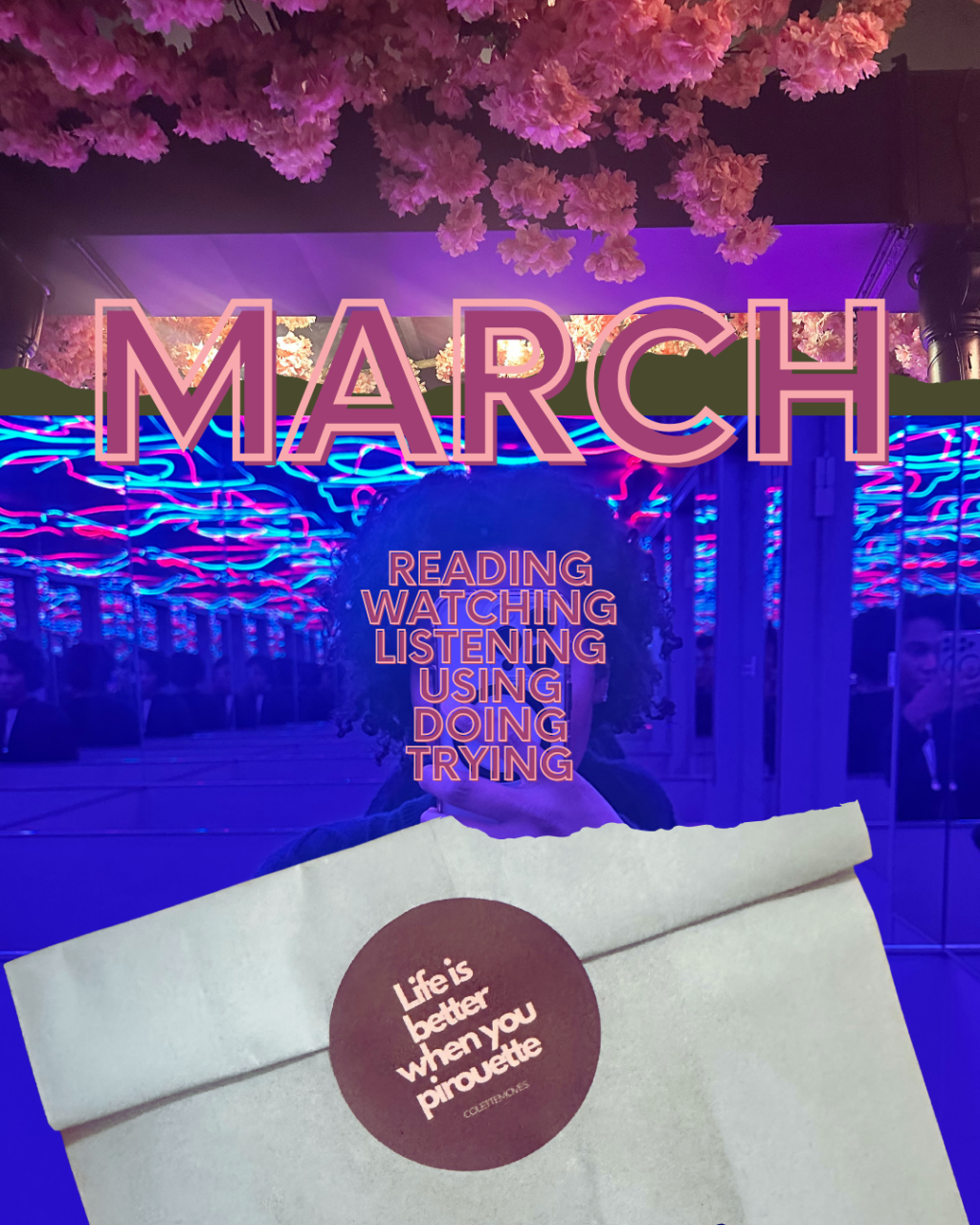 I’ve decided to try writing this monthly list of things I’m reading, watching, listening to, using, doing, and trying. I hope with this, I can find more glimmers in my everyday life.
