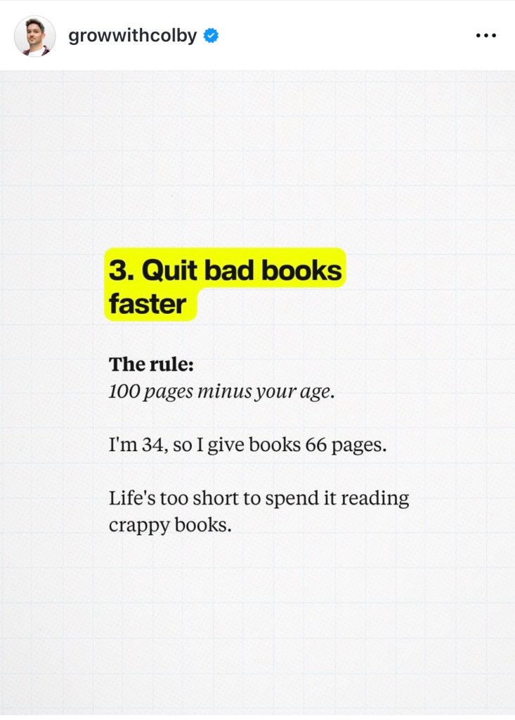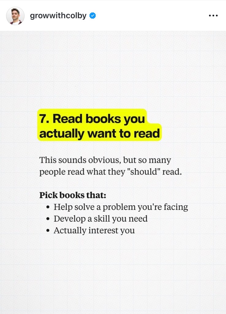 Another takeaway from @growwithcolby was simple: “Read books you actually want to read.”